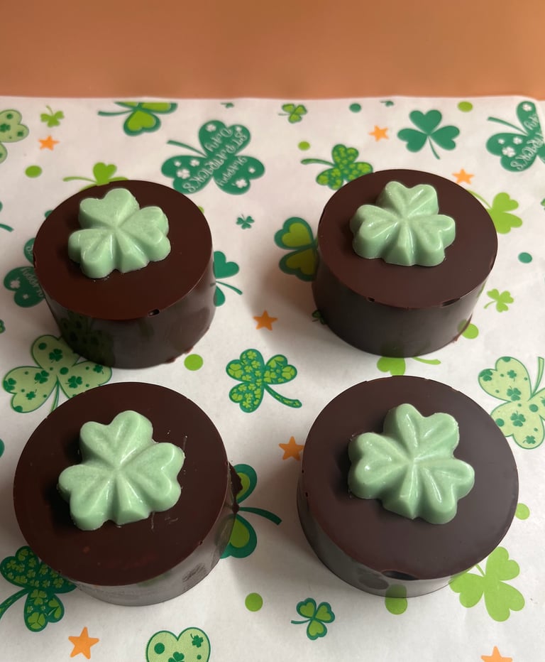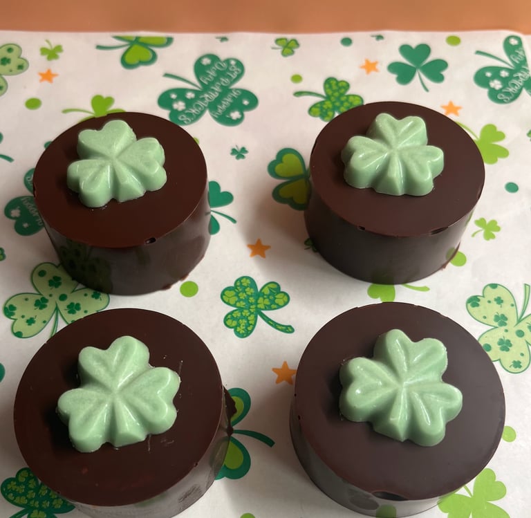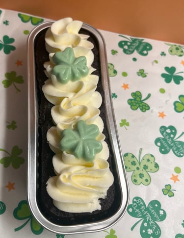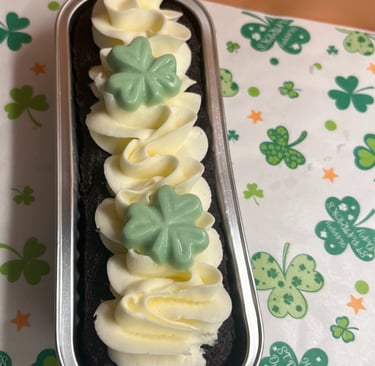 Moist, rich, chocolatey cake topped with buttercream and white chocolate clovers to celebrate