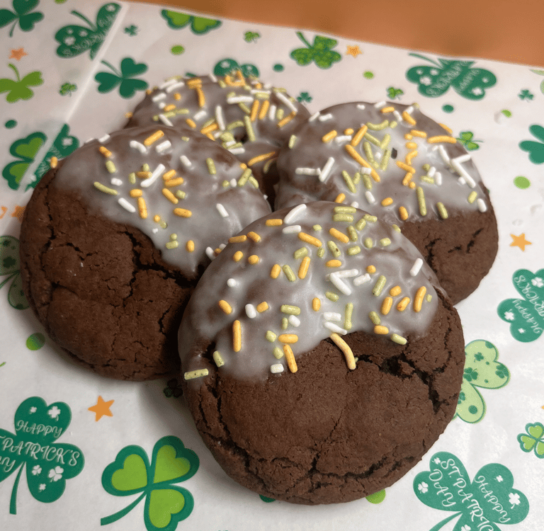 Soft, chewy cookies flavored with smooth Irish Cream and rich cocoa, topped with a glaze and naturally dyed sprinkles for a festive look