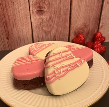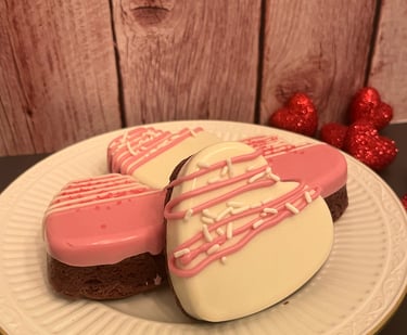 Fudgy heart-shaped brownies dipped in creamy white chocolate with sprinkles