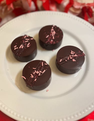 Rich peanut butter pucks coated in smooth dark chocolate with sprinkles
